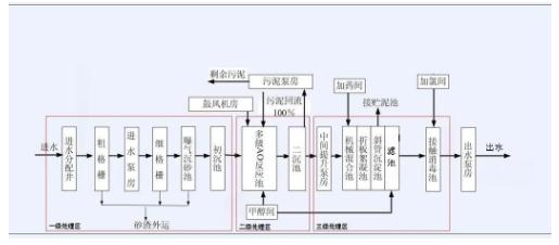 典型的污水厂处理工艺流程是上述方法的组合。以某一级a标准污水处理厂为例,从进水到出水主要分三级处理区,一级处理区主要应用物理法(包括拦截、沉淀、除砂等)及一定的化学法(初沉池前絮凝);二级处理区是污水处理工艺核心,主要是以活性污泥为主的生化反应(酶促反应);三级处理区主要应用物理化学法,通过混凝、过滤、消毒等工艺手段对污水进行深度处理。落实到具体处理工程中,各级各类技术需针对不同污染物和污染情况进行应用和改进。