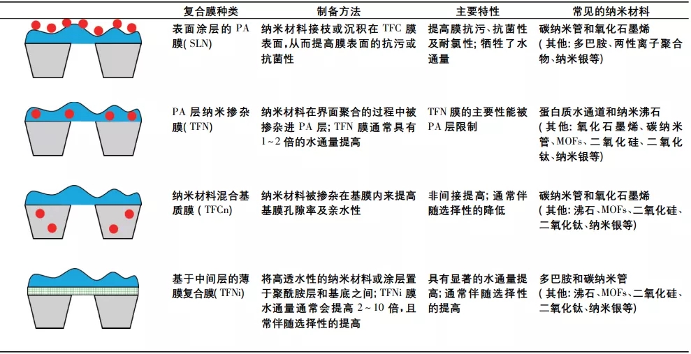 常见的纳米复合nf膜可分为表面涂层的nf膜(sln)、聚酰胺层纳米掺杂膜(tfn)和纳米材料混合基质膜(tfcn)等。这3种膜的结构和主要特性见表2。sln 膜可由纳米材料在聚酰胺层表面接枝或沉积获得。通过纳米材料修饰后的膜表面可大幅提高膜的抗污染性或抗菌性,从而提高膜清洗效率,延长膜的使用寿命”。但是由于额外的表面涂层,会不可避免地增加膜的阻力,从而降低了膜的水通量,增加了操作压力及能耗。liu等利用两性离子高分子刷来改性商品膜表面,大幅提高了膜表面的亲水性。改性后的tfc膜对牛血清蛋白的黏附显著降低,大幅提高了膜的抗污染性能。另外,由于膜表面亲水性的提高,改性的复合膜也可大幅降低疏水性污染物(如内分泌干扰物或农药)的溶解扩散过程,提高了疏水性污染物的去除。guo等利用多巴胺涂层改性nf90商品nf膜,发现膜表面的亲水性提高,有助于对内分泌干扰物的去除。未来,tfc膜设计不仅要考虑对盐的去除,也要着重考虑对污染物的选择性去除,从而保证出水回用安全。传统nf膜的聚酰胺层中的酰胺键容易受到氯的攻击而发生降解,导致去除率下降。表面涂层或接枝后的tfc膜则可以避免聚酰胺层与氯的直接接触,从而提高膜的耐氯性。