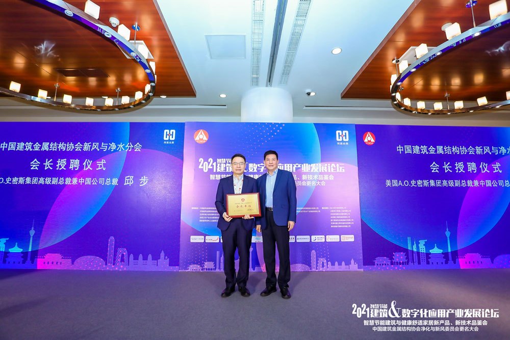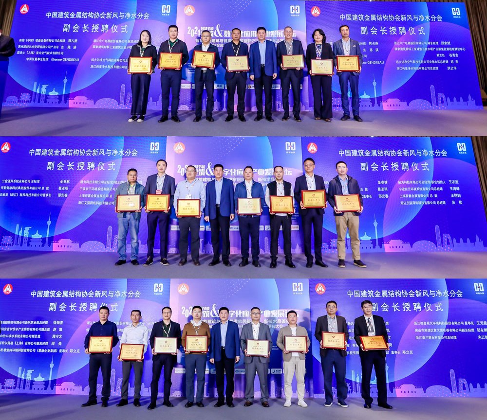 王贺宣读了《关于中国建筑金属结构协会新风与净水分会聘任会长及副会长的决定》,宋为民为 a.o.史密斯集团高级副总裁兼中国公司总裁邱步颁发会长单位证书及聘书。随后,有关领导向行业头部品牌单位及代表,颁发了中国建筑金属结构协会新风与净水分会副会长单位证书及聘书,给常务委员及会员单位颁发证书及聘书,向区域工作站颁发证书,给创新中心颁发聘书,并举行副秘书长授聘仪式。