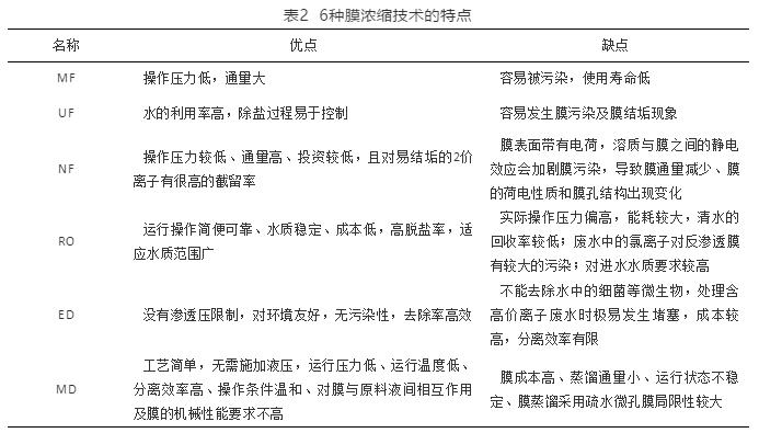 膜浓缩技术是将压力差、浓度差及电位差作为驱动力,通过物质组分与膜之间的尺寸差异、电荷排斥和物化作用实现废水的分离、提纯和浓缩。由于膜浓缩技术具有操作简便、产水稳定、成本较低等优点,近年来在废水脱盐中的应用比热浓缩技术更为广泛,主要包括微滤(mf)、超滤(uf)、纳滤(nf)、反渗透(ro)、电渗析(ed)和膜蒸馏(md)。通过膜两侧的压力差mf能够截留0.1~1 nm的悬浮物、细菌等物质,uf能截留大于0.01 pm的微生物、蛋白质等物质。nf的孔径和截留能力介于uf和ro之间,基于筛分效应和道南效应对2价阴阳离子有很高的截留率,在工业高盐废水的分盐处理中具有良好的效果。ro利用膜对物质不同的选择透过性,达到过滤分离的作用,常用于高盐废水零排放中比较典型的有高效反渗透(hero)、碟管式膜技术(dtro)和振动剪切强化反渗透(vsepro)。ed是将电化学与渗析扩散结合,通过电位差对离子交换膜的作用选择性地去除离子,得到的产水水质良好,从而达到分离纯化的目的。目前在化工、造纸、轻工、冶金、制药和医药等高盐废水的处理过程中具有广泛的使用。md是蒸馏与膜分离技术的结合,在蒸气压差作用下蒸气式组分透过疏水微孔膜,冷凝后实现水与非挥发性物质的分离。截至目前,已经用于脱盐、废水处理等多种分离过程。将上述6种膜浓缩技术进行对比,如表2所示。