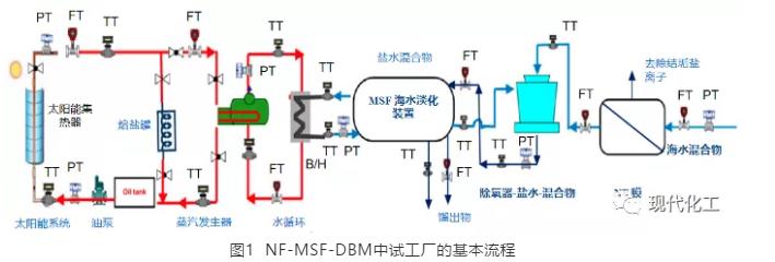 目前,浓缩与结晶技术已广泛用于处理工业废水的实际工程中,并取得了可观的效果。vuong发明的两级nf-nf在淡化含盐废水方面比传统的单级反渗透系统节约20%~30%的成本,并在美国长滩某工厂成功地投入到实际运用中,日产水量达到1 135 m3。ettouney等利用热浓缩技术mvr法处理含盐量3.5%的工业废水,系统脱盐率高达99.66%,tds最高不超过130 mg/l,出水水质满足《城市污水再生利用工业用水水质》。chan等利用膜蒸馏技术和结晶技术处理ro浓缩液,清水回收率达到95%。相比热浓缩技术和膜浓缩技术各自单独作用,将2种技术耦合处理废水可达到优化的效果。工业上在med之前先经过nf预处理,首效温度能提高60℃(65~125℃),且没有结垢危险。turek等通过nf-ro-med-cr(结晶器)系统,使得盐水淡化的回收率达到78.2%,成本降低至0.5美元/m3。hamed等提出的nf-ro-msf系统通过利用nf膜将海水中的结垢离子去除,使msf系统得到更高的首效温度,从而提高淡水产水率,延长msf的使用寿命。以此为基础,mabrouk等发展了nf-msf-dbm装置,如图1所示,中试结果表明,该曝气与盐水混合装置的首效温度能够提升到100~130℃,造水比达到原有msf系统的2倍,产水率增加19%,同时成本降低了14%。