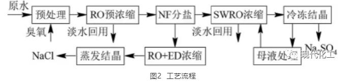 另外,浓缩耦合技术在回收高盐废水中的有效资源方面也发挥了积极作用。liu等研究用新型nf-ed集成膜技术分离盐水中的1价、2价离子,其中ca2+、mg2+的截留率分别为40%、87%,nacl的回收率约为70%。ali等采用ro+md技术对浓盐水进行处理,相对于传统技术而言,该工艺组合的稳定性及出盐品质更好,水的回收率可达到90%以上,以达到水资源与结晶盐回收的目的。此外,中国石油化工采用“管式微滤-多级反渗透-多级电驱动离子膜-硝蒸发结晶-盐蒸发结晶”的工艺路线处理粉煤气化高盐废水,通过中试项目,得到的na2so4质量分数在96%以上,nacl质量分数在98%以上,混盐仅占总盐量的5%以下,成功实现无机盐分质结晶资源化。某石化工业高盐废水采用膜分盐及膜浓缩高效组合集成工艺进行分质结晶,工艺流程如图2所示,nacl和na2so4的质量分数分别达到97.5%和98.6%,杂盐产率小于10%,实现了高盐废水零排放与资源化利用,从而提高水资源的利用率,对经济效益、环境效益和社会效益具有极其显著的影响。