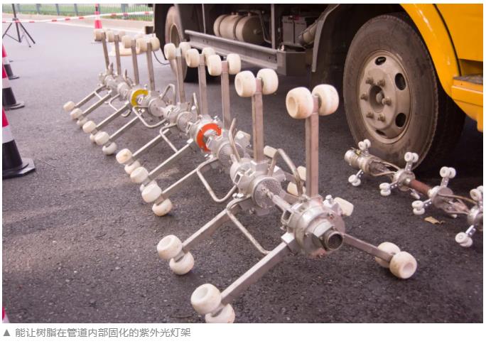 这项管网修复“微创术”,是将浸渍了光敏性树脂的软管拖入待修复的管道内,再向软管内注入压缩空气,使软管紧贴管道内壁,最后放入紫外光灯架照射,使树脂在管道内部固化,形成一段高强度内衬管。施工结束后,路面干净整洁。