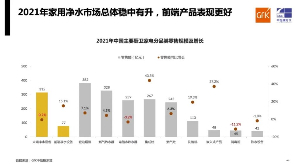 2021年,家用净水市场总体稳中有升,前端和末端净水设备零售额分别达77亿元和315亿元。但前端产品表现更好,其2021年零售额同比增长了15.1%,而末端净水设备则同比微降了0.7%。