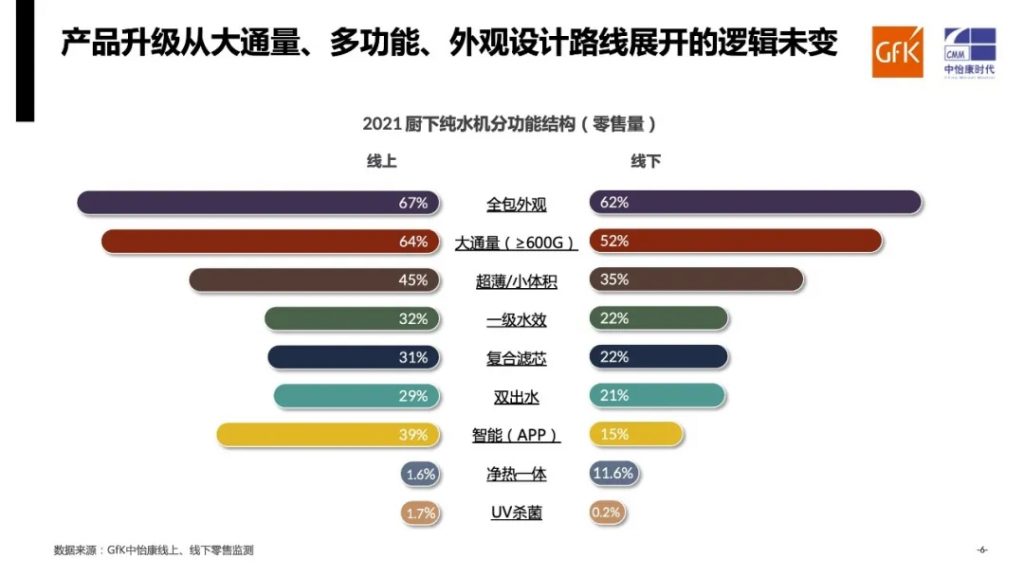随着消费需求的不断提升,净水设备产品升级从大通量、多功能、外观设计路线展开的逻辑依然未变。从2021年厨下纯水机市场表现来看,“全包外观” “大通量”“超薄/小体积”等是热销款式主要功能卖点趋势延续。