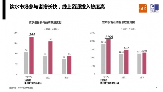 据gfk中怡康零售监测数据可见,2021年家用饮水市场参与者快速增长,双线渠道品牌数量达144个,比上一年度增加了58个;在销型号2108个,比上一年度增加了292个。尤其是线上渠道,资源投入的热度走高,2021年全年参与品牌数达127个,在销型号1467个。