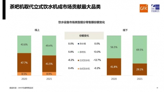 聚焦具体品类,近两年家用饮水设备市场中茶吧机表现突出,2021年线上市场零售额份额达49.4%,比2020年增长了5.8%;线下市场零售额份额达69.5%,比2020年增长了13.0%。茶吧机取代了立式饮水机,成为2021年市场贡献最大的品类。