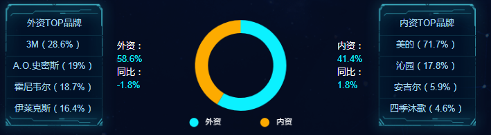 2021年1月精装净水市场品牌内外资结构,数据来源:奥维云网(avc)地产大数据