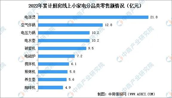 从细分市场来看,中国厨房小家电市场中,销售额排名前列的多为实用性较强的高品质、多功能型产品。奥维云网数据显示,2022年电饭煲线上零售额最高,为21.8亿元;其次是空气炸锅,线上零售额为12.8亿元。此外,煎烤机、养生壶、咖啡机等新品类市场份额也在不断扩大。