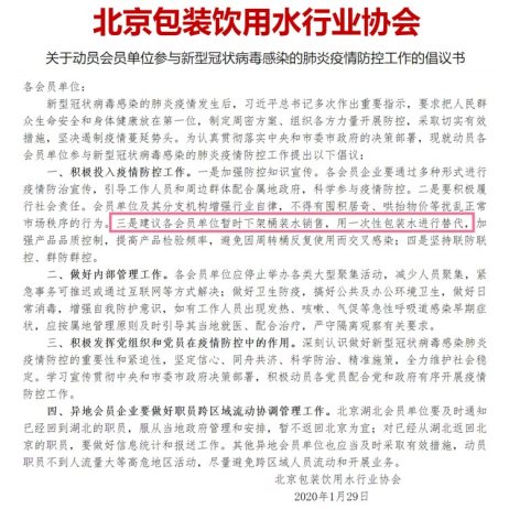1月初,北京包装饮用水行业协会签发了一份倡议书,建议疫情期间下架桶装水,避免因周转桶反复使用而交叉感染。