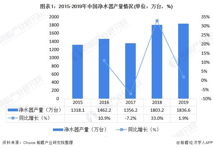 净水器也叫净水机、水质净化器,是按对水的使用要求对水质进行深度过滤、净化处理的水处理设备。近年来,中国净水器市场不断发展,从供给端来看,2015-2019年,我国净水器产量呈现波动增长的趋势。2019年,我国净水器产量达到1836.6万台,同比增长了1.9%,由于需求端动力的下降,增速有所下滑。
