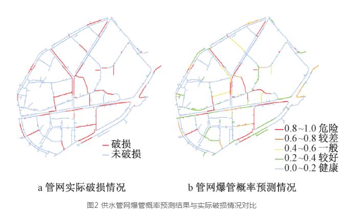 以评估供水管网运行风险为例,深圳市水务(集团)有限公司选择爆管风险作为供水管网运行风险的评估指标,选取管材、管径、管龄、道路负荷、运行压力、杂散电流、是否发生破损等影响因子,采用随机森林模型构建了供水管网爆管风险评估模型,取得了较好的预测结果(见图2),以该数值的大小来量化评价供水管网运行风险,并作为制定供水管网更新改造计划的重要数据参考。