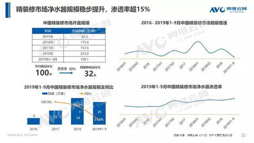 来自奥维云网的数据显示,2019年1-9月我国精装修商品住宅净水器配置率超15%,同比增速达23%。随着饮水健康观念的普及,越来越多家庭认识到水质安全的重要性,更多商家看到健康水市场的光明前景。