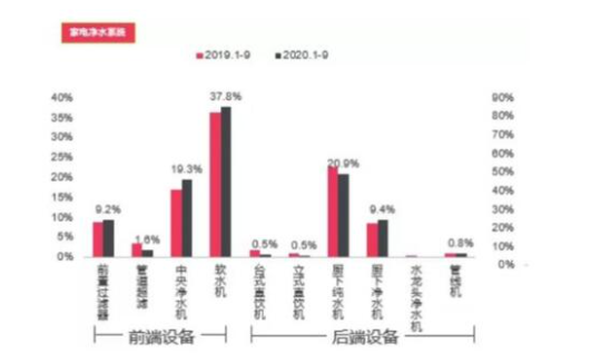 根据中怡康的调研监测数据,2020年1-9月家用净水系统在10城市125家建材渠道达成销量269千台,是建材渠道需求量最大的家电产品,实现零售额14.38亿元,同比增长9.2%。受今年疫情因素影响,线下建材终端门店闭店及限流的影响,在疫情高峰期第一季度家用净水系统销售规模探底,二季度后复苏反弹,5月份为上半年最高峰值,后续月份增长强劲。