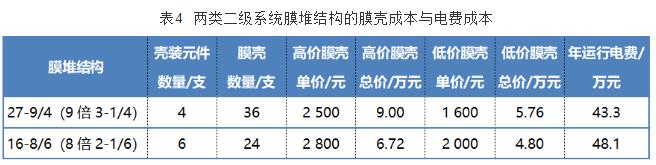 由表 4可知,27-9/4(9倍3-1/4)的短流程结构比16-8/6(8倍2-1/6)的长流程结构的膜壳总价仅增加9.00-6.72=2.28万元,而年运行电费可节省48.1-43.3=4.8万元,因此可知短流程结构较长流程结构具有明显的经济优势。9倍3-1/4结构与8倍2-1/6结构的唯一缺点是:二级系统的4支装膜壳与一级系统的6支装膜壳在膜堆架构上存在长短差异。但该缺点与其经济技术优势相比,不足为虑。