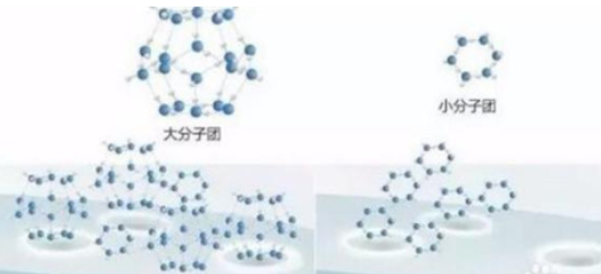 科学家们应用核磁共振技术观察到水中水分子的结构。正常水是在140—150赫兹每个水分子团有13—15个水分子组成,称为大分子团水。世界卫生组织规定,进入100赫兹以内每个水分子团有5—7水分子组成,称为小分子团水。又称为五角水或六角水。人们都知道雪片就是六角形的,海水,胎儿的羊水都是小分子团水。