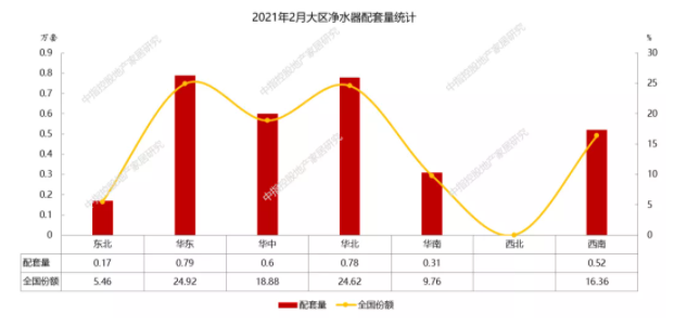 2月份,各大区域净水器配套规模差距较小