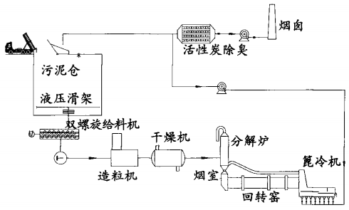 污泥送人污泥仓后,依次经过液压驱动滑架、双螺旋给料机,经污泥泵输送到造粒机造粒,再经过干燥机干燥,干化后呈细粉状的污泥经输送机送人分解炉焚烧。干燥机作为换热装置工作时热源为水泥生产中的废热资源。热烟气可与污泥直接接触,也可间接接触。