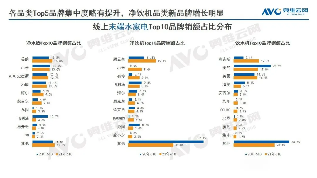 另外,美的、小米、海尔、沁园、安吉尔、九阳、飞利浦等品牌,不仅在净水器销售中表现优越,在净饮机、饮水机等末端水家电中的销售额同样名列前茅, 末端净水各品类top企业品牌集中度有所提升。