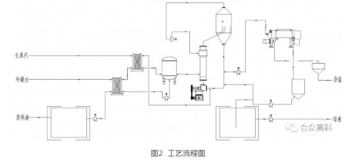 蒸发结晶装置进水是经膜系统减量浓缩后产生的浓盐水,蒸发过程产生的合格冷凝水送至回用水箱,其浓缩液经结晶处理得到混盐,最终实现零液体排放。